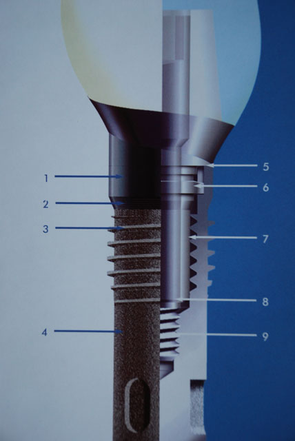 Implantat - das Implantat eignet sich für den Ersatz von einem Zahn oder von mehreren Zähnen. Es ist eine aus Titan hergestellte Kunstzahnwurzel. Seine zur zeit allgemein verbreitete Form kann eine Schraube oder ein gestufter Pfosten sein. Das Material ist aus reinem Titan, dessen Oberfläche zum Einbau im Knochen und zur Anlagerung zum Zahnfleischgewebe speziell angefertigt wird.
